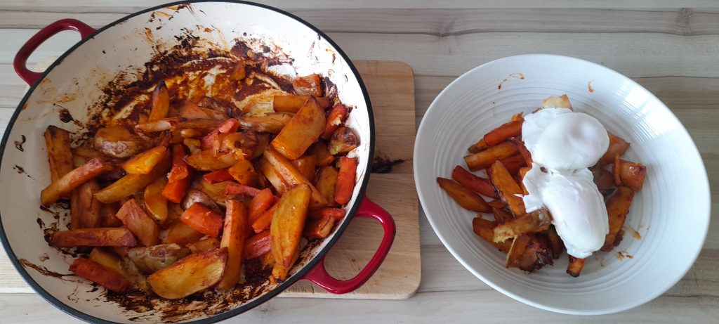 Potatoes, kohlrabi, carrots, and gochujang chilli paste went into the oven for thirty minutes. When they emerged, he placed two poached eggs on top.