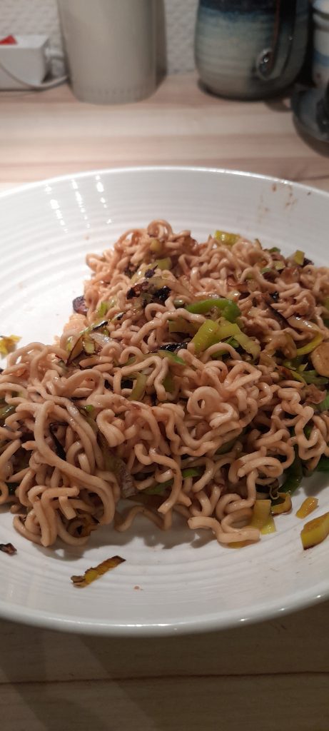 Leeks and noodles become dinner.
